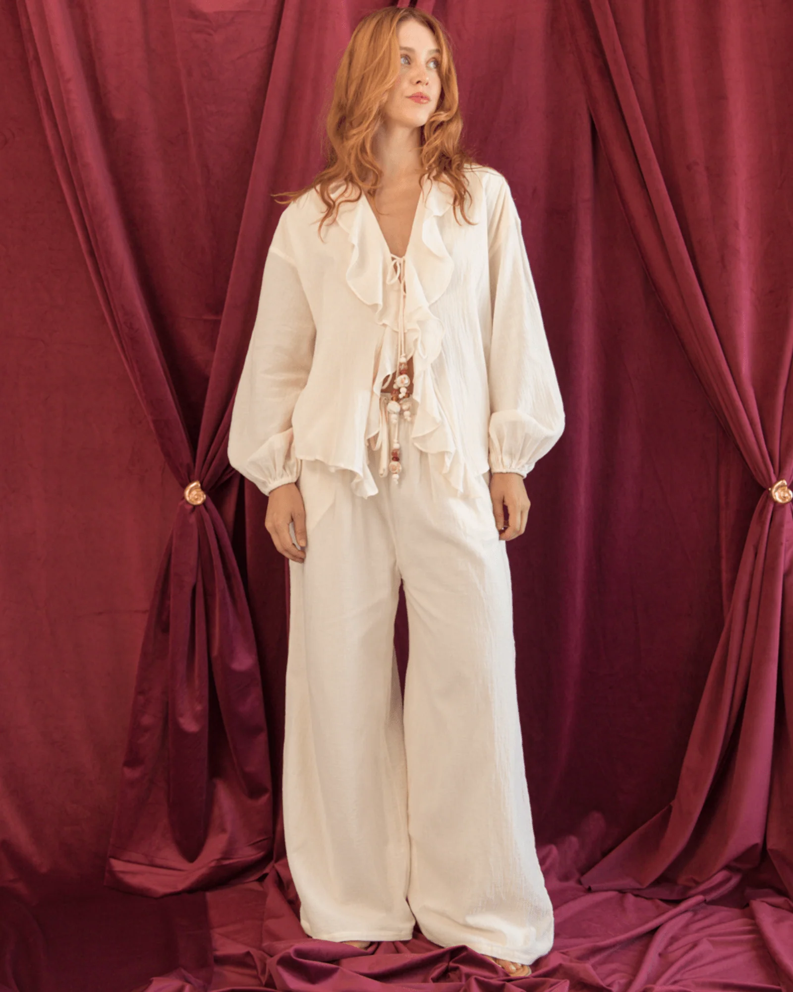 The ruffled neckline, long billowed sleeves and hand threaded beaded ties create a beautifully feminine silhouette that feels relaxed yet elevated. She is easy to style, comfortable to wear and designed to move with you from slow mornings to sunset dinners.