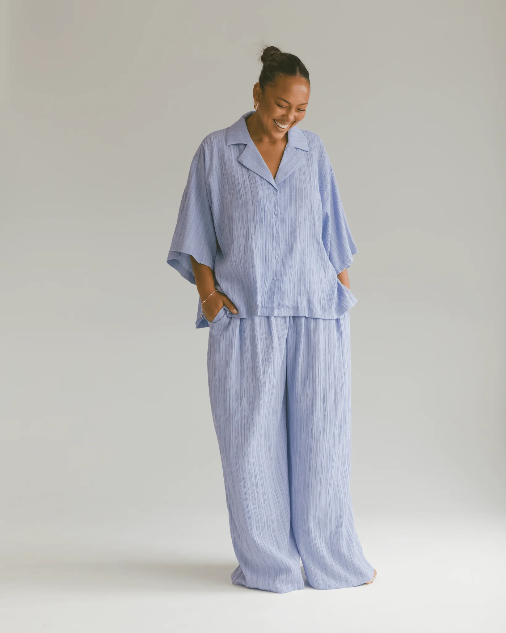 Our Crepe styles are crafted from a beautiful, breathable blend designed for comfort and elegance. Due to the nature of the loose weave, this fabric is more delicate than our cotton and linen pieces and requires extra care to maintain its quality and longevity.