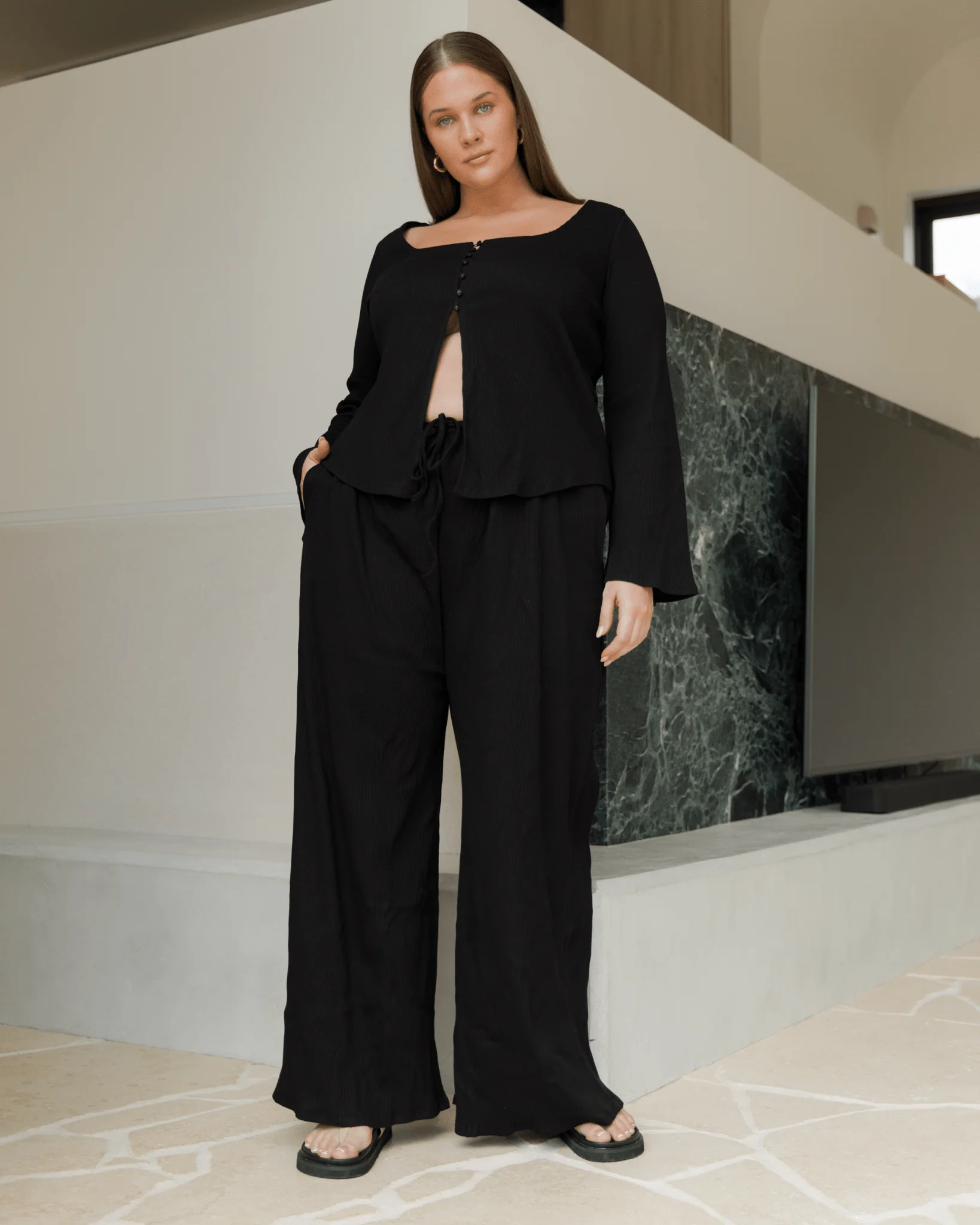 Your new go-to for that sweet spot between cozy and cute — meet the Marisa Ribbed Pants in Black. These wide-leg lounge pants are made from a soft, stretchy ribbed knit that moves with you and feels as good as it looks. Think dreamy comfort, with just the right amount of structure.