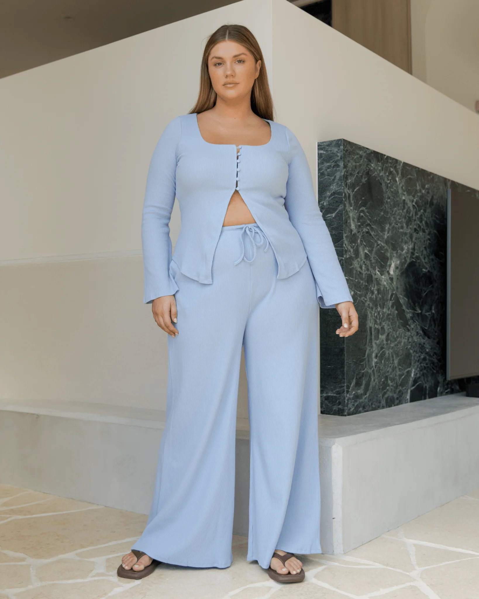 Your new go-to for that sweet spot between cozy and cute — meet the Marisa Ribbed Pants in Blue. These wide-leg lounge pants are made from a soft, stretchy ribbed knit that moves with you and feels as good as it looks. Think dreamy comfort, with just the right amount of structure.
