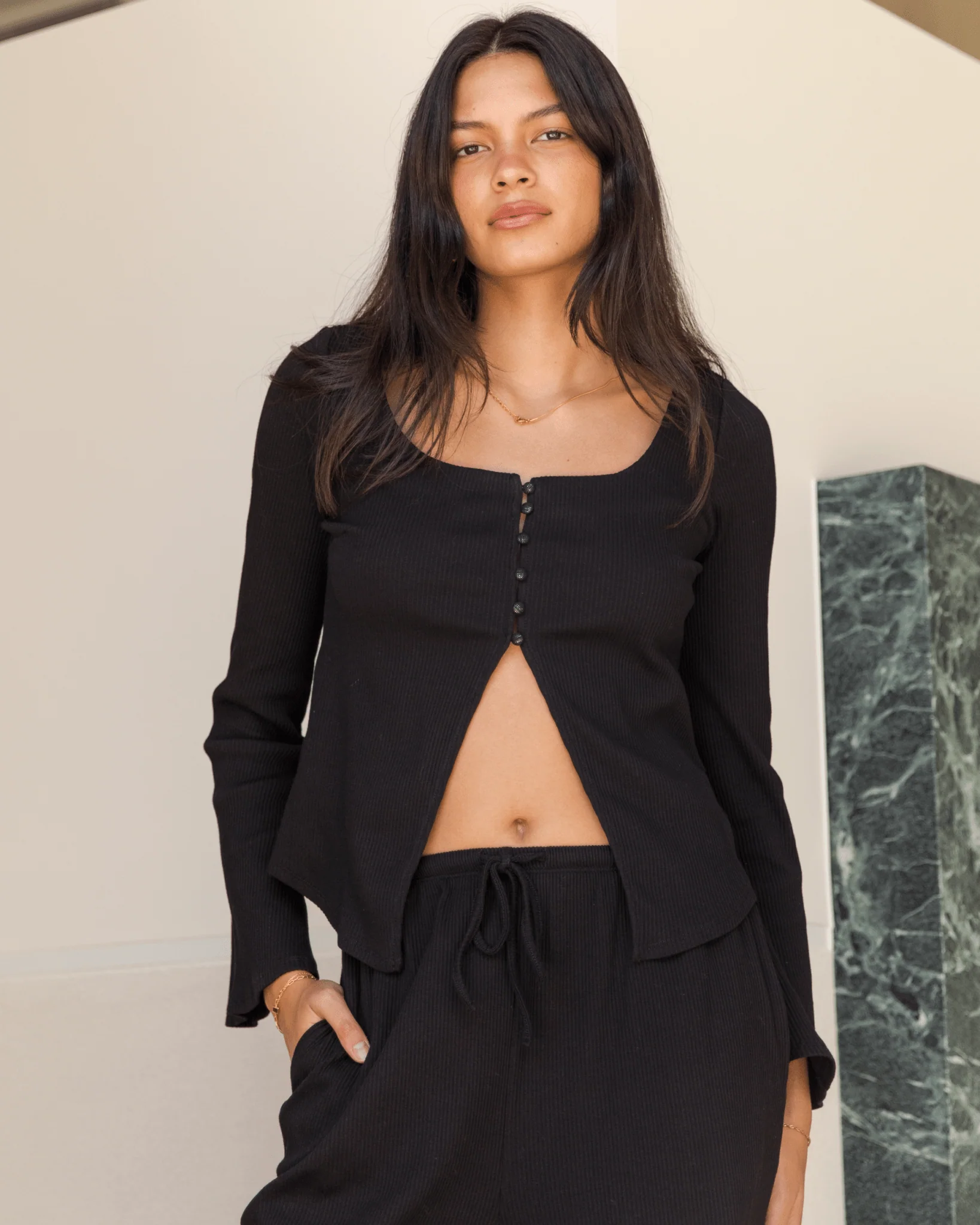 With a flattering square neckline, functional front buttons, and a subtle flared sleeve, the Marisa is equal parts comfy and cute. The ribbed fabric gives it that elevated texture you can dress up or down, while the slight front split adds a modern, playful edge.